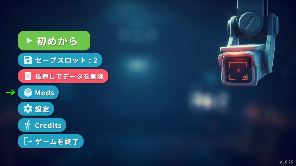 エスケープ フロム ダッコフを起動したら、タイトルメニューから「Mods」を開きます。
