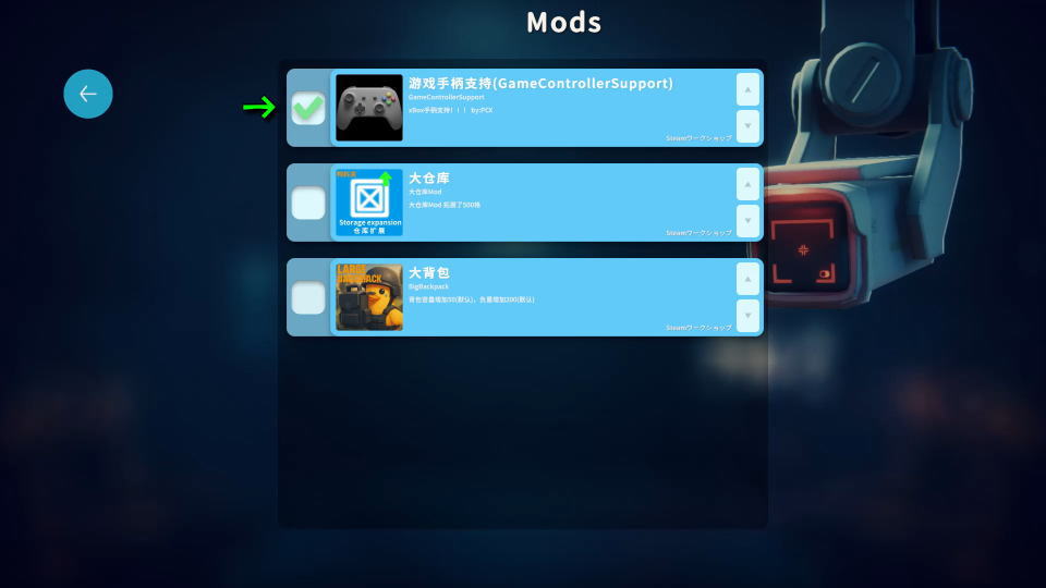 Modsを開いたら、先ほど導入したMOD「GameControllerSupport」を有効化します。