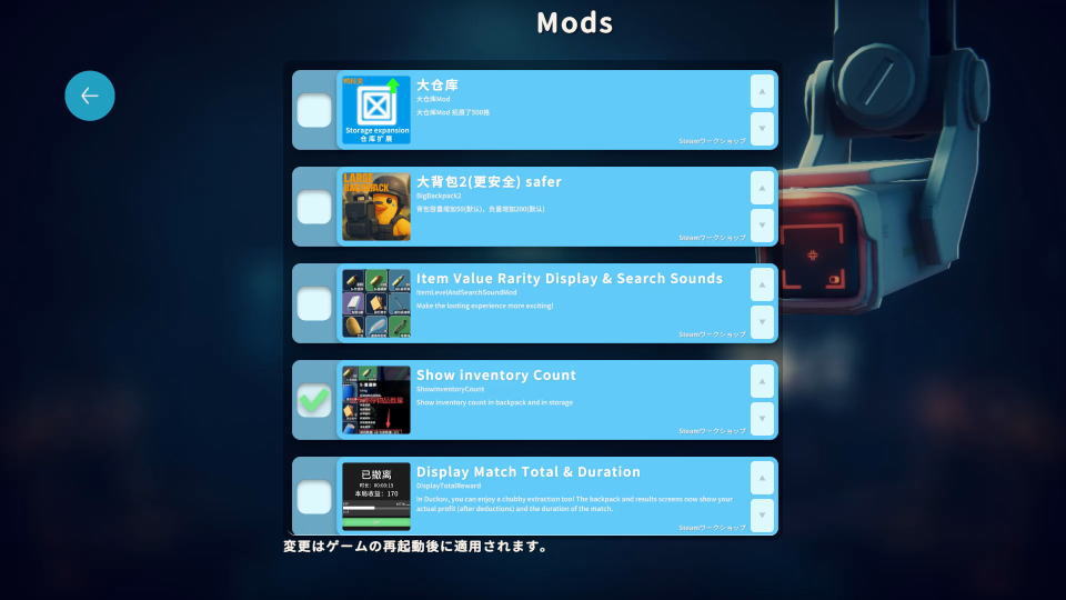 上記のリンクから「Show inventory Count」を購読して、タイトルメニューから有効化したらダッコフを起動します。