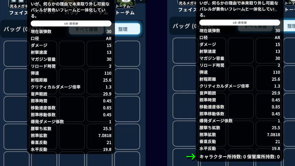 しかし「Show inventory Count」を導入すると『キャラクター所持数』と『保管庫所持数』が追加されます。
