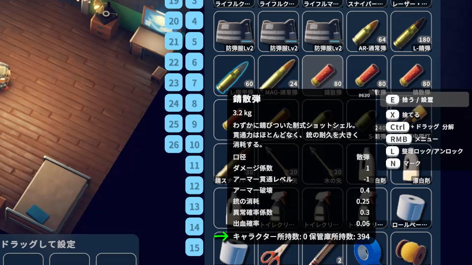 例えば倉庫(保管庫)に多数ある弾を例にすると、このように『保管庫所持数:394』と表示されます。