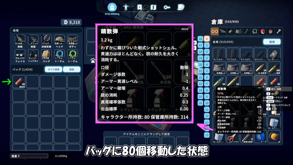 この状態からバッグに弾を80個移動すると、下記のように倉庫内にある弾の表示が変化します。