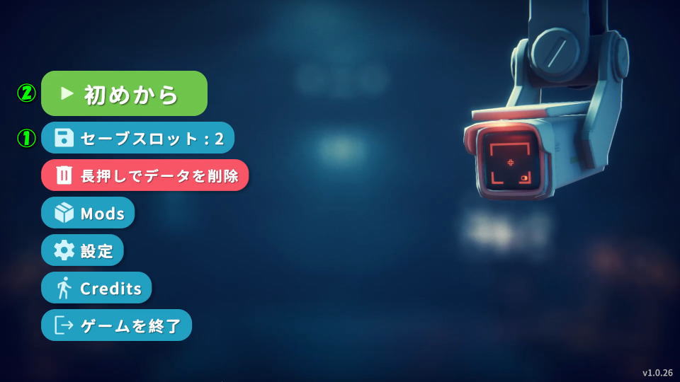 タイトルメニューに戻ったら、①でセーブスロットが変更されたことを確認して②の「初めから」です。