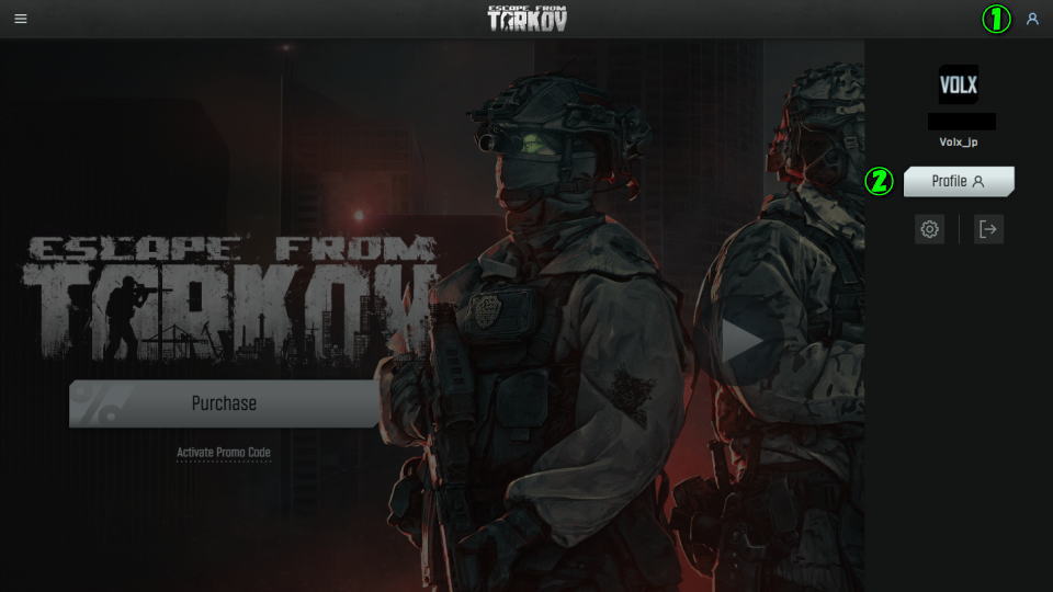 タルコフ公式サイトに移動したら、右上のアイコンから「ログイン」して「Profile」を選択します。