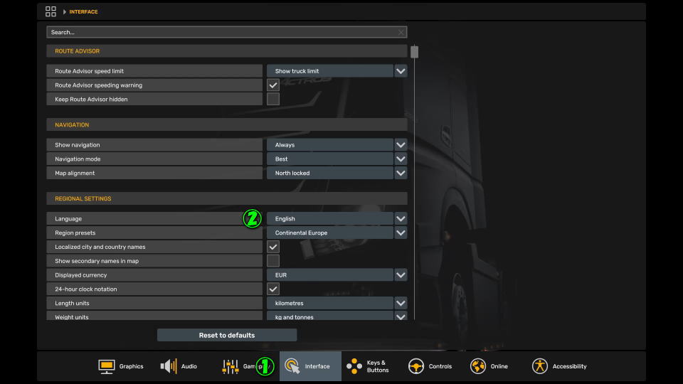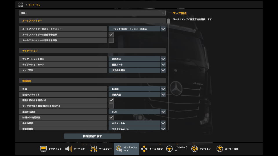 するとすぐに日本語が反映され、Euro Truck Simulator 2の日本語化が完了します。