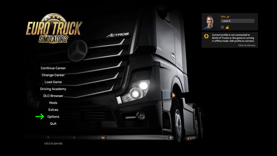 Euro Truck Simulator 2を日本語化するには、タイトルメニューから「Options」に進みます。
