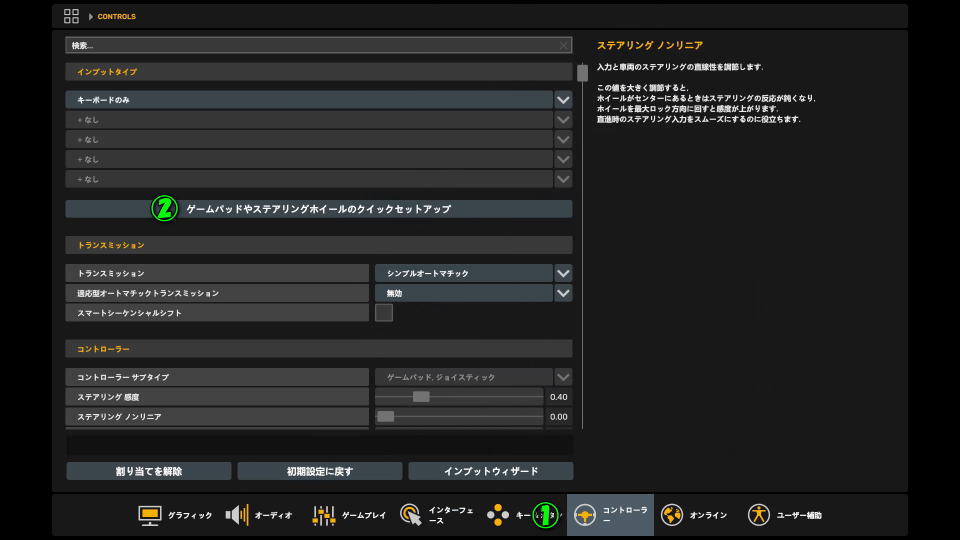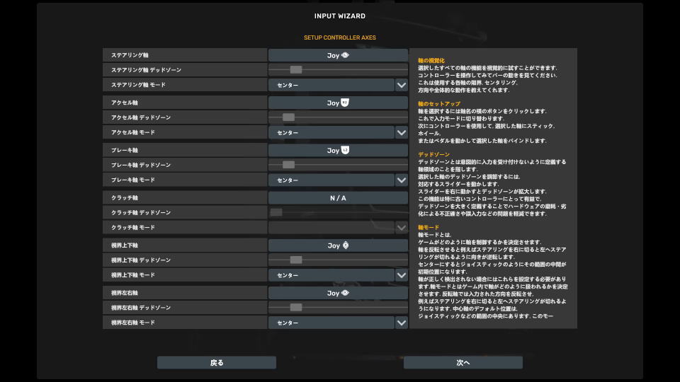 このアドバンス設定では、ステアリングやアクセルおよびブレーキなどの詳細設定が可能です。