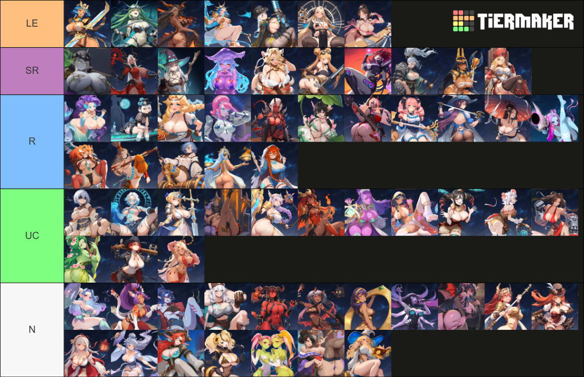 記事掲載時点における「各レアリティ別」のランキングで、各階層内では左のキャラほど「最強」です。