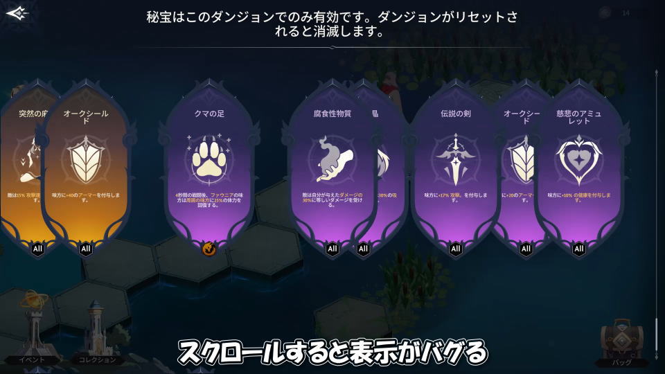 ダンジョンはマスの選択と戦闘、およびバフの選択を繰り返していくイベントです。