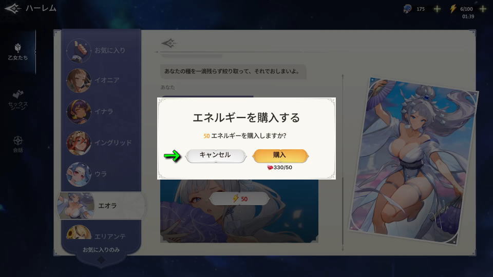 キャラクターとの会話イベントを進める「ハーレム」は、画面中央下部にあります。