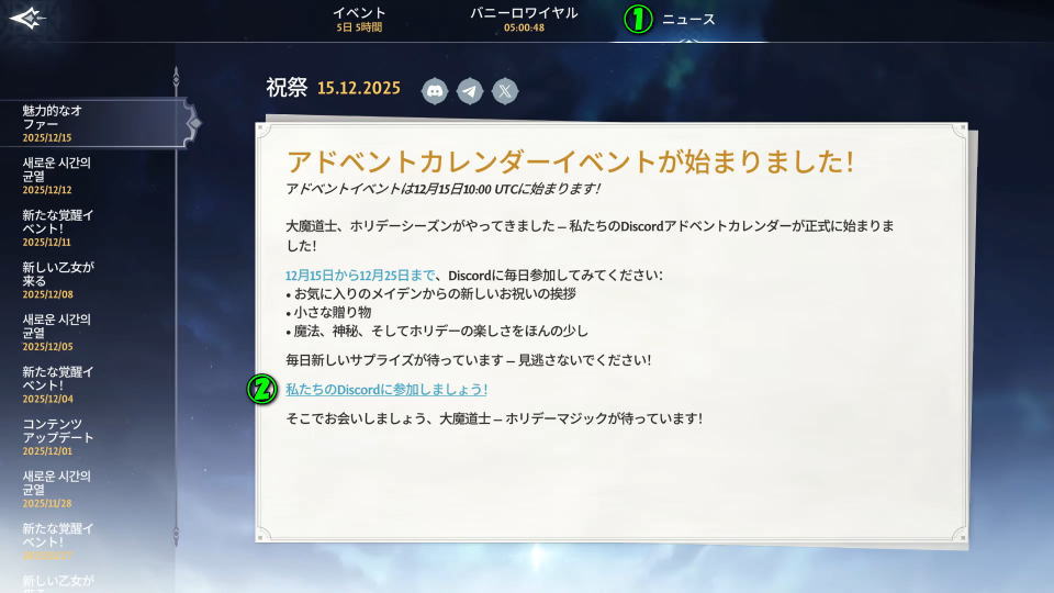 イベントに移動したら「ニュース」タブから任意のニュースを開き『私たちのDiscordに参加しましょう!』を選択します。