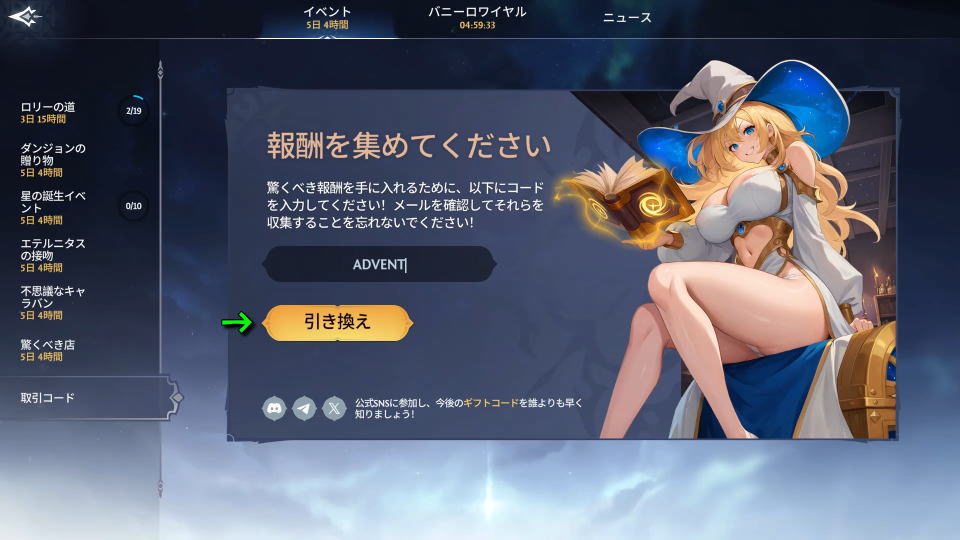 有効なコード(記事掲載時点ではADVENT)を入力し「引き換え」を押してみました。