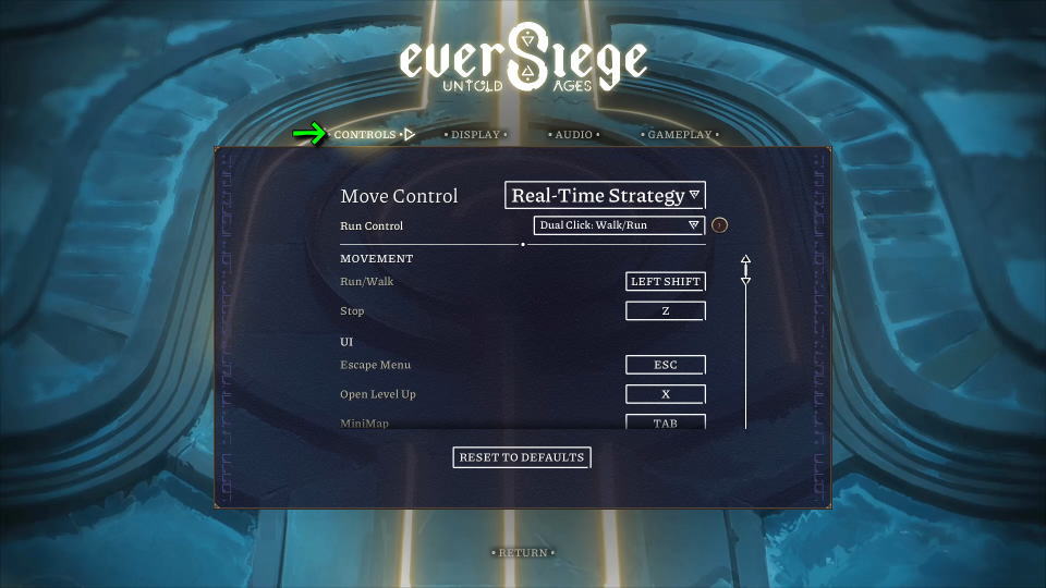 EverSiege Untold Agesの操作を確認するには、前述したOPTIONSから「CONTROLS」に進みます。