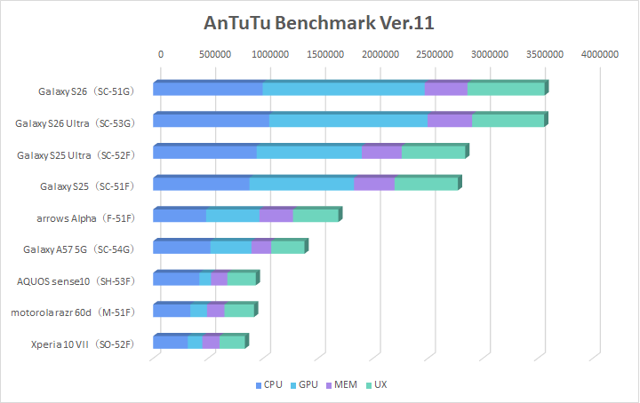 | AnTuTu Ver.11 | 型番 | Total | CPU | GPU | MEM | UX |