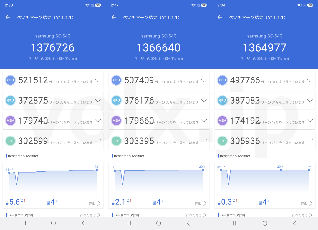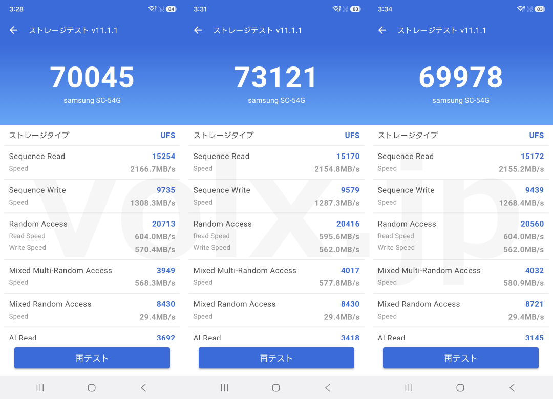 AnTuTu benchmarkで、総合とストレージを3回1セット行いました。