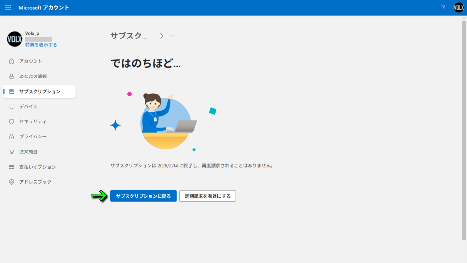 『ではのちほど…』が表示されたら「サブスクリプションに戻る」を選択します。