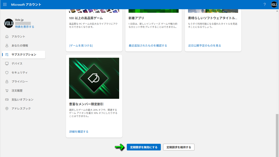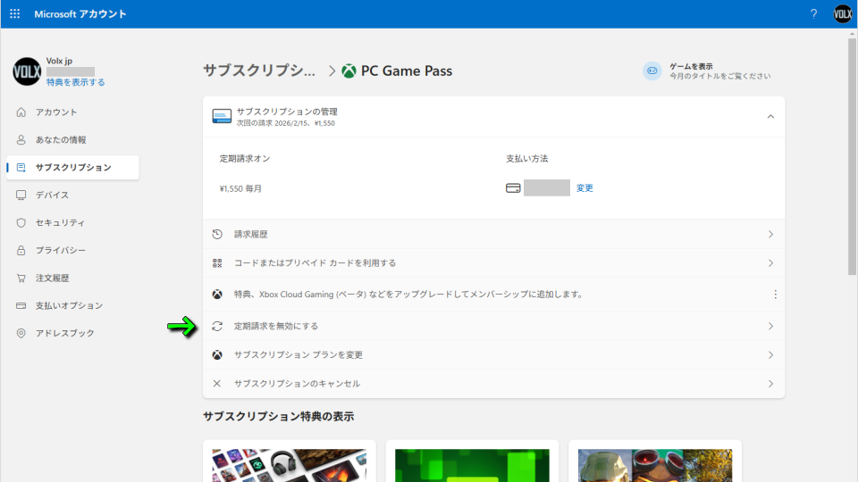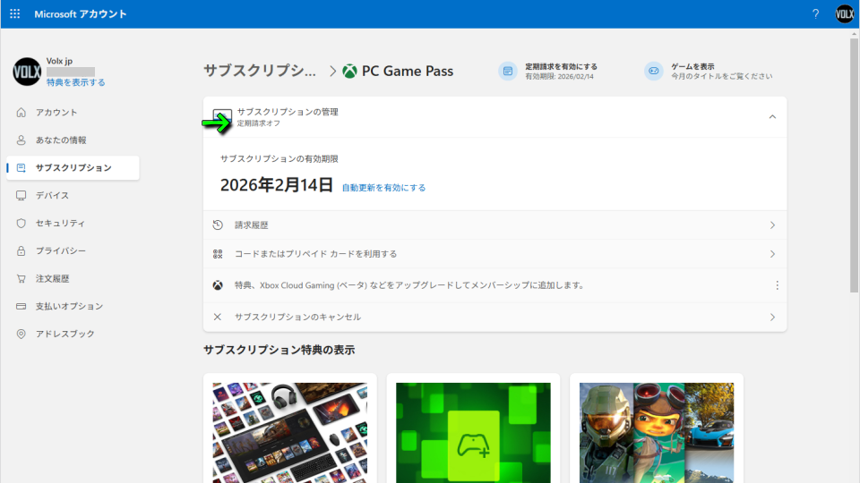 Game Passはサブスクリプションサービスのため、放置していていると定期請求が行われます。
