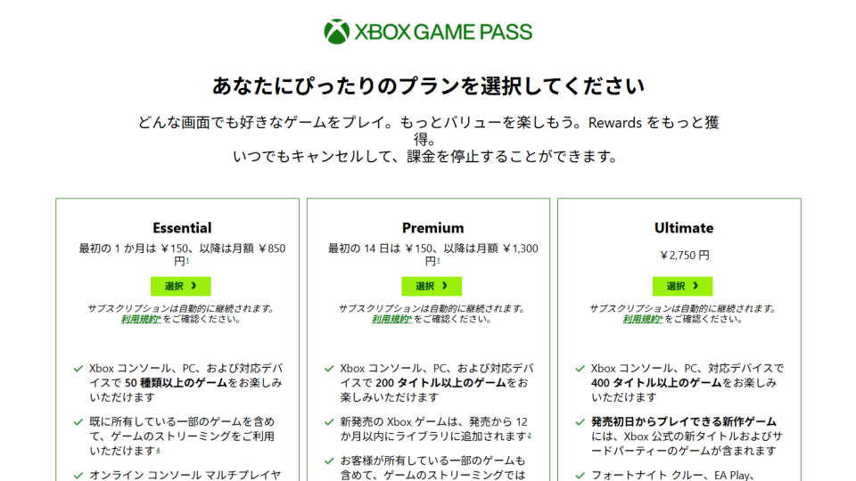 この図では「Game Pass Essential」と「Game Pass Premium」が、150円から試用できます。