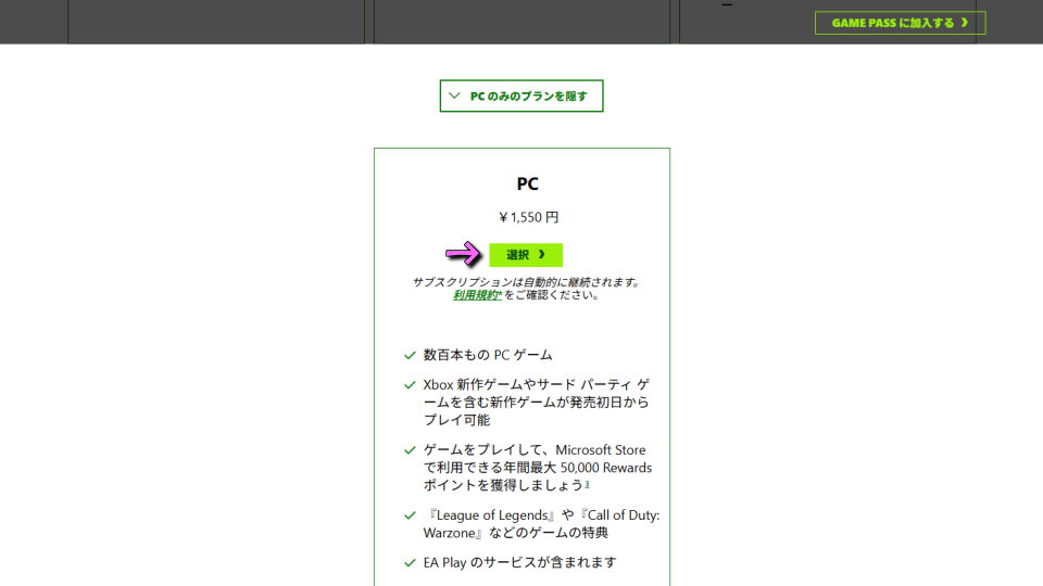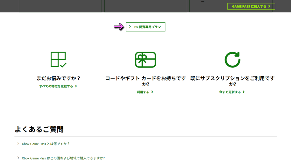 PC閲覧専用プランを開くと、冒頭で解説した「PC Game Pass」に加入できます。