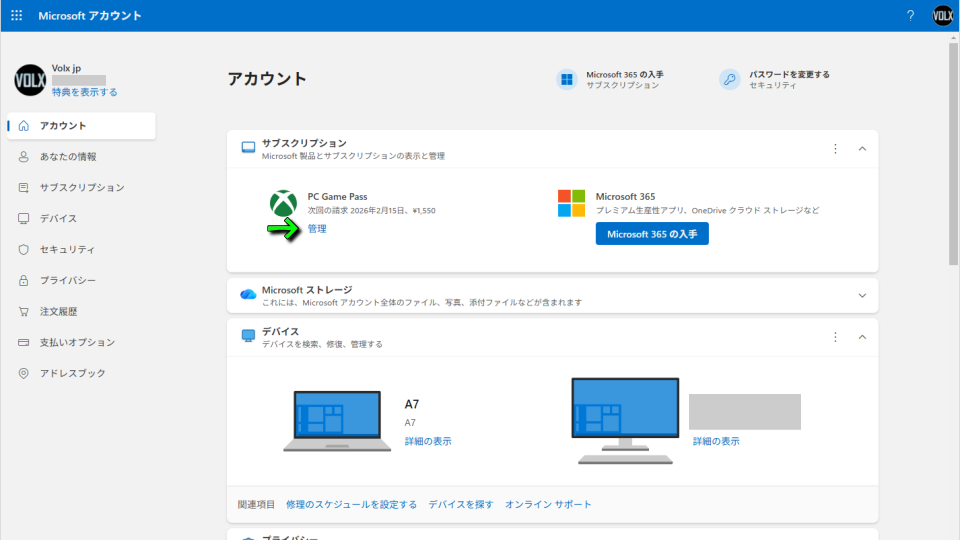 Microsoftアカウントに移動したら、サブスクリプションにある「管理」を選択します。
