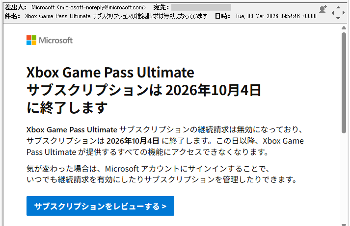 定期請求が無効されると、Game Passを登録したメールアドレス『Xbox Game Pass Ultimate サブスクリプションの継続請求は無効になっています』というメールが届きます。