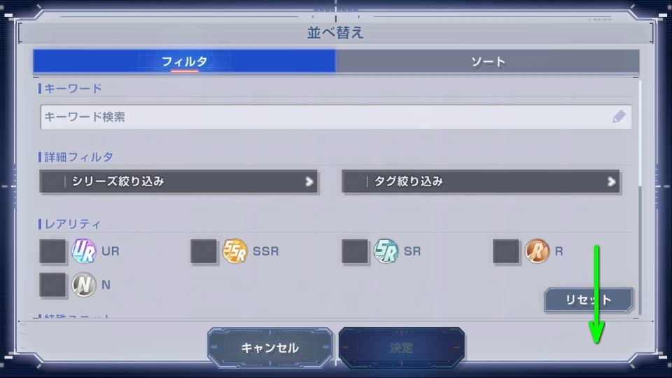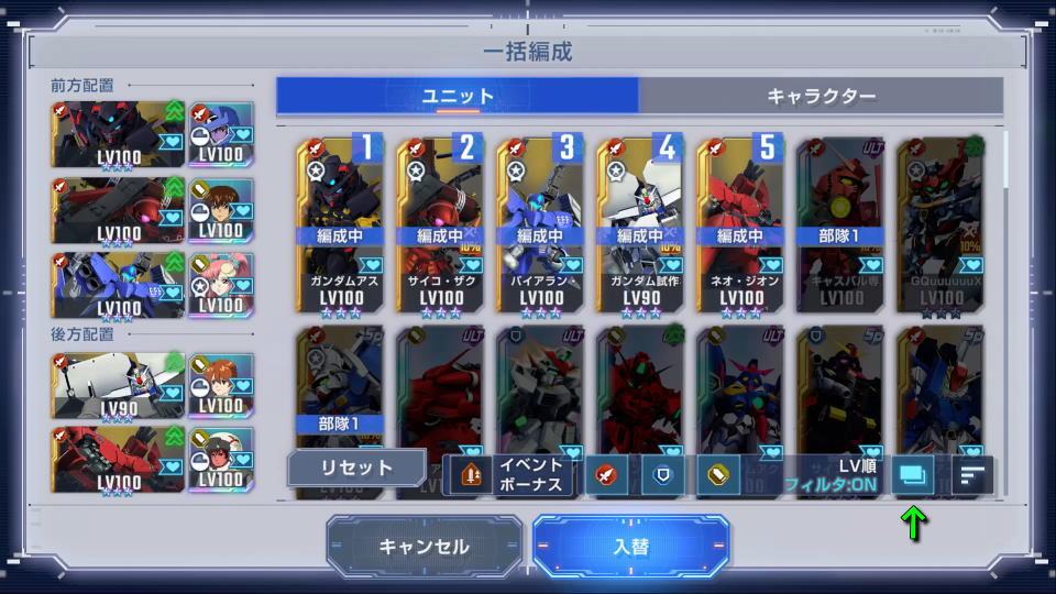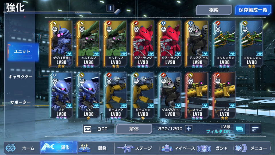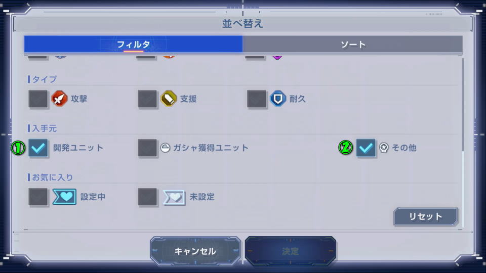 開発ユニット / その他ユニットだけを表示するには、まず部隊の編成画面で「フィルター」を選択します。