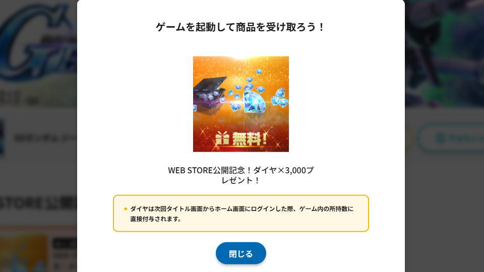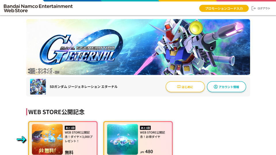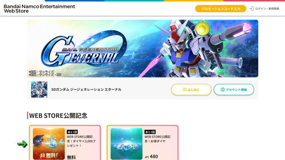 Bandai Namco Entertainment Web Storeに移動したら『WEB STORE公開記念』の中にある「WEB STORE公開記念!ダイヤ×3,000プレゼント!」を選択します。