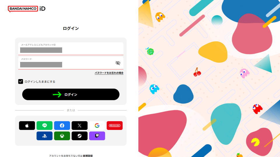 このときバンダイナムコIDの画面が表示されたら、ジージェネエターナルと連携しているIDを入力します。
