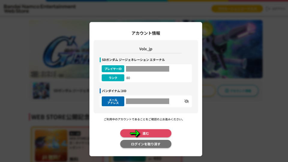このようにジージェネエターナルのアカウント情報が表示されたら、確認して「進む」を選択します。