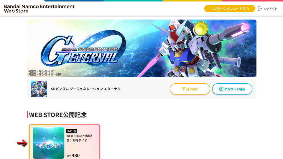 ジージェネエターナルのダイヤを無料で得るには、まず「Bandai Namco Entertainment Web Store」にアクセスします。