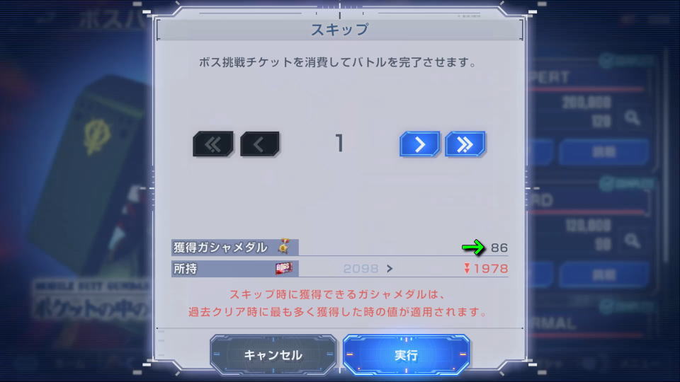 合計86枚の報酬を確定したら、次回以降は『挑戦』ではなく「スキップ」を選択します。