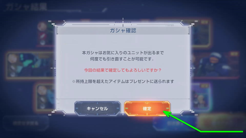 引き直しガシャの結果に満足したら、抽選画面の右側の「確定させる」から「確定」します。