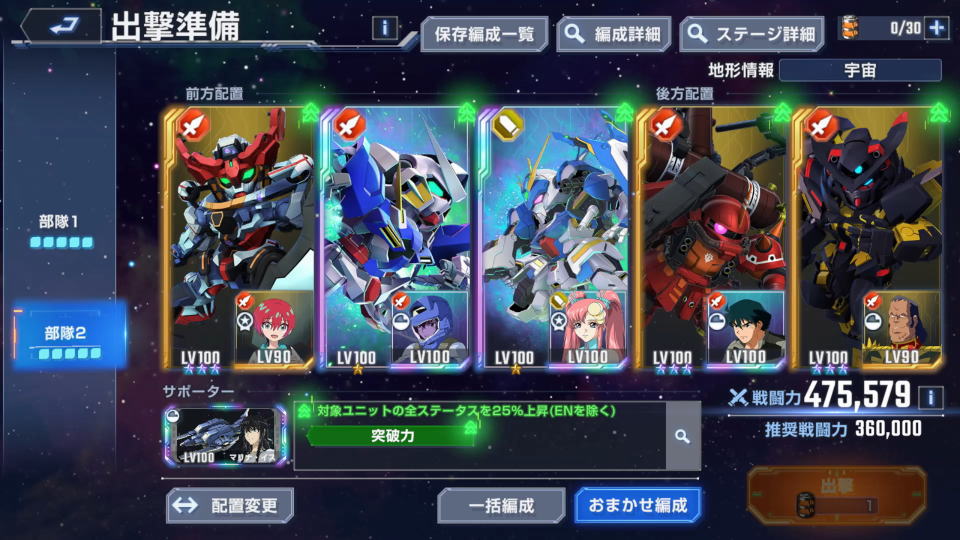 最大ブーストを獲得した状態の「部隊1」と「部隊2」を用意して、電光石火と突破力で部隊を分けます。