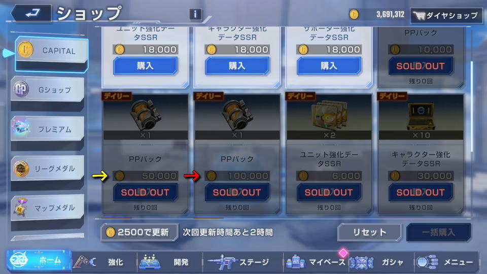毎日更新されるリストの中から任意の「PPパック」を、CAPITALと引き換えに入手します。