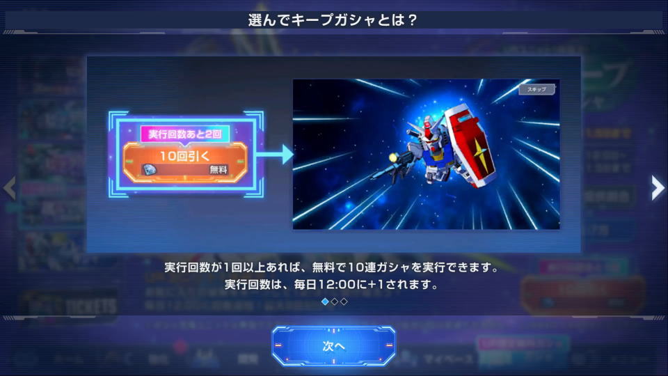選んでキープガシャは毎日昼の12時に補給され「実行回数」がある状態であれば引くことができます。