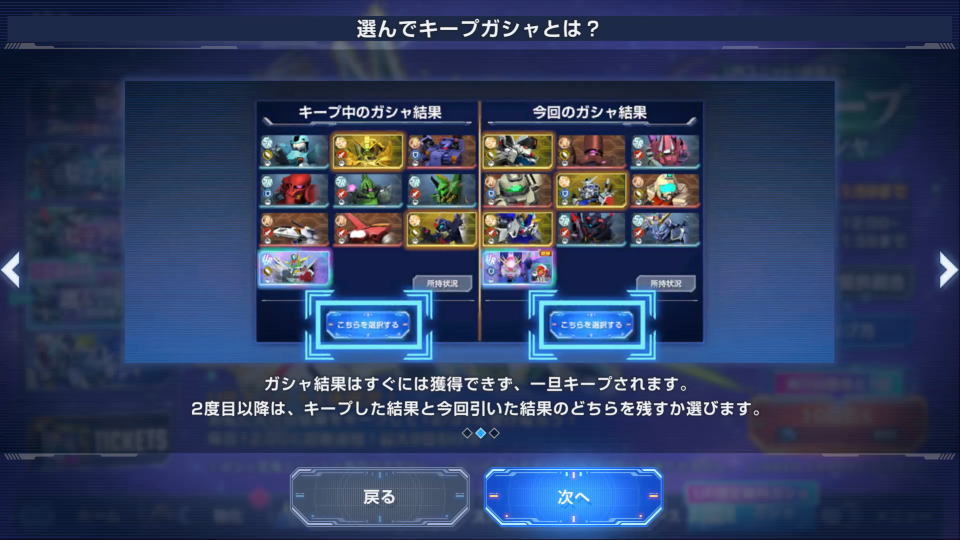 ガシャを引くと、このように「どちらのガシャ結果をキープするか」という選択画面が表示されます。