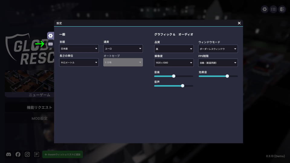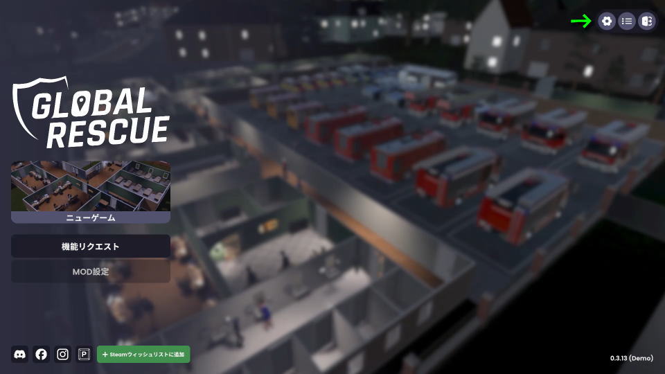 Global Rescueの操作を確認するには、タイトルメニュー右上にある「設定」に進みます。