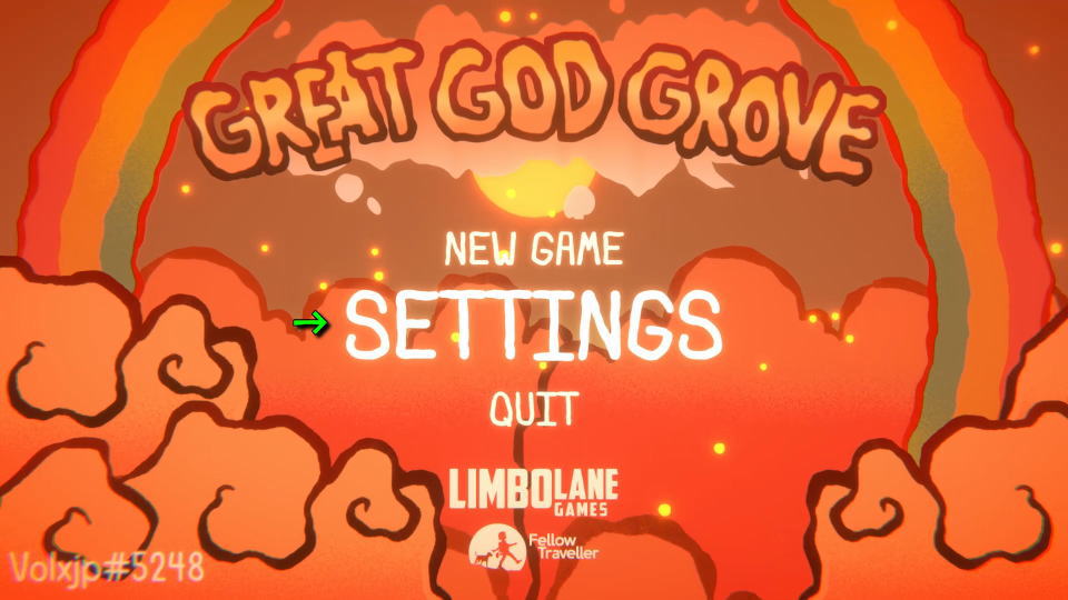 Great God Groveの操作を確認するには、タイトルメニューから「SETTINGS」に進みます。