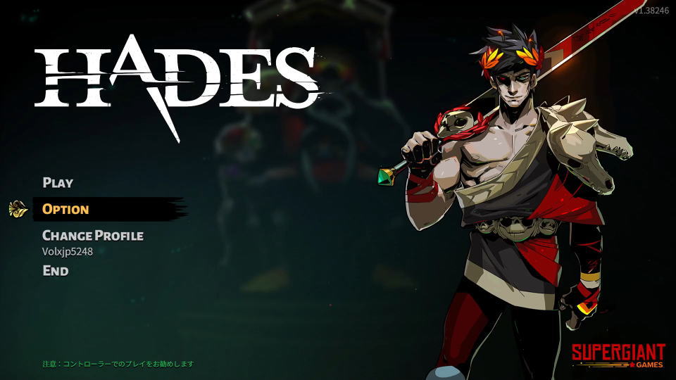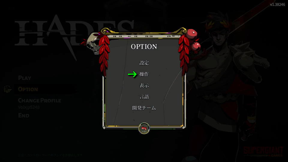 Hadesの操作を確認するには、タイトルメニューから「OPTION」に進みます。