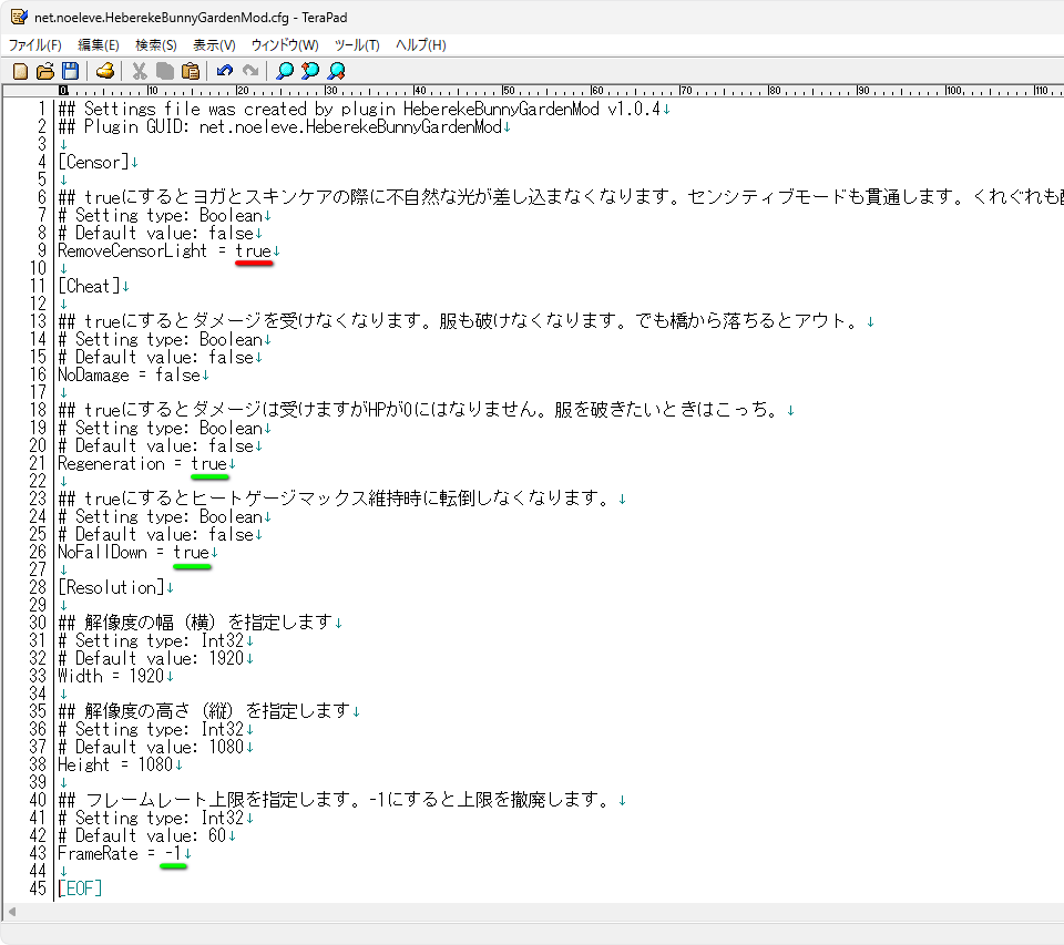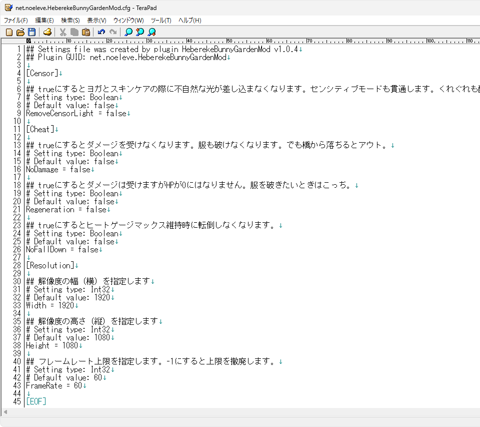 対象のディレクトリを開いたら「net.noeleve.HeberekeBunnyGardenMod.cfg」をテキストエディタで開きます。