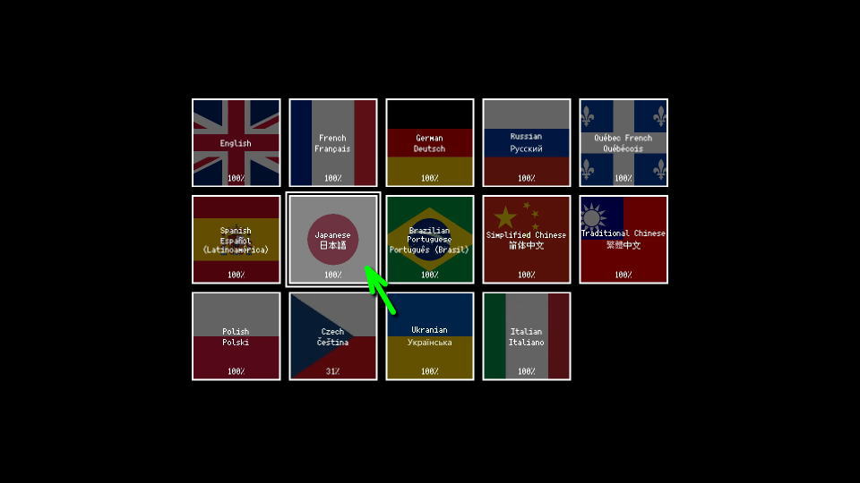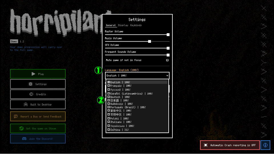 Horripilantを日本語化するには、起動直後の画面で「Japanese(日本語)」を選択します。