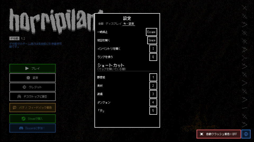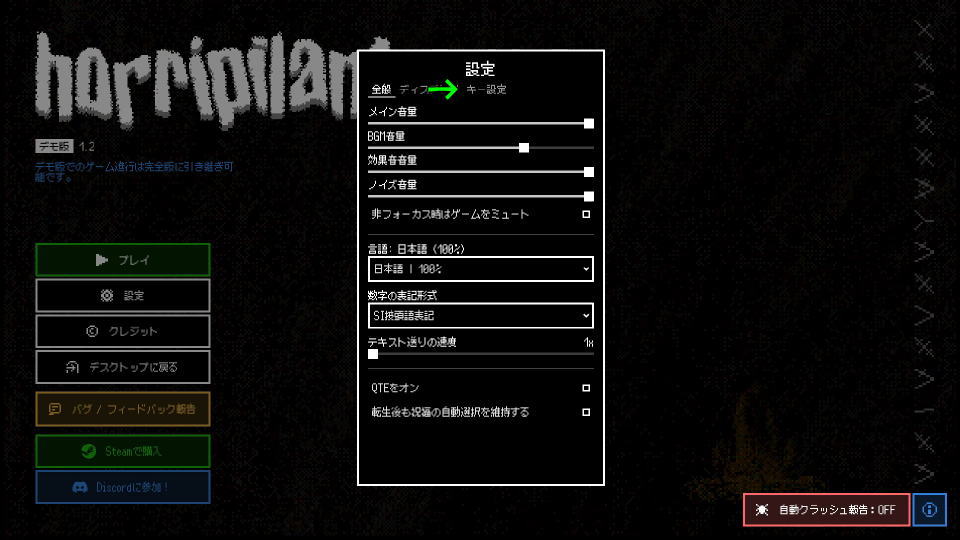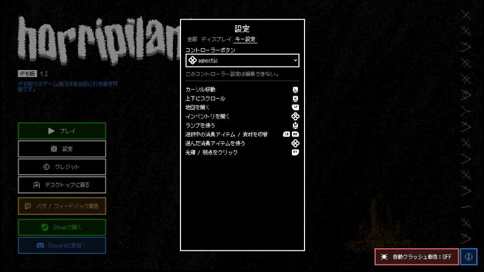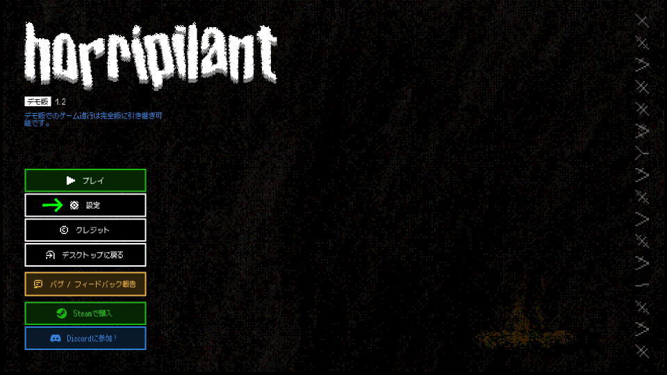 Horripilantの操作を確認するには、日本語化済みのタイトルメニューから「設定」に進みます。