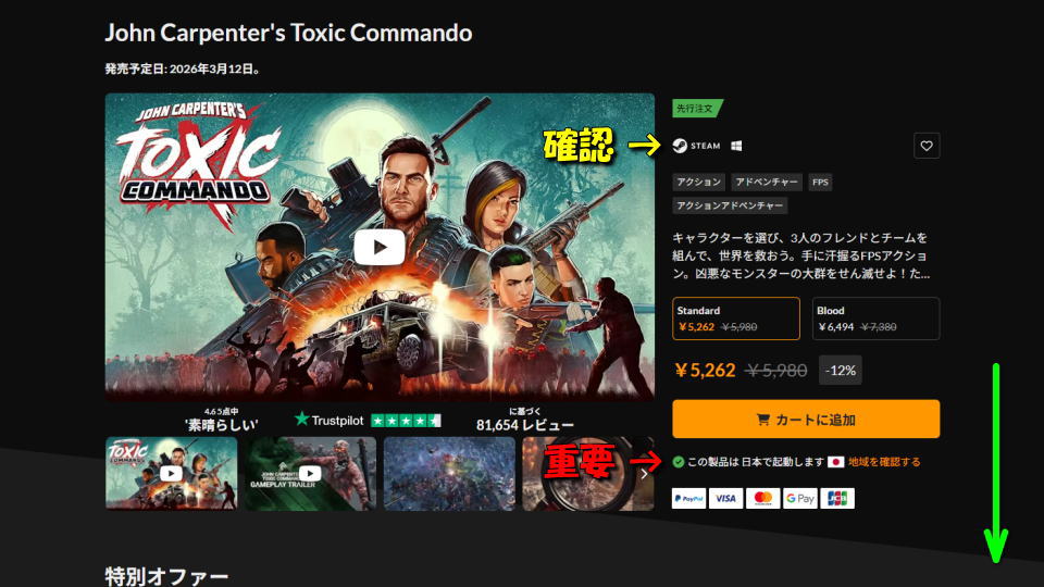 John Carpenter's Toxic Commandoが表示されたら、プラットフォームや日本認証などを確認して画面を下にスクロールします。