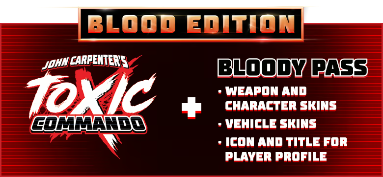 John Carpenter's Toxic Commandoの「Blood Edition」には、ゲーム本編に加えてコスメティックパック: Bloody Passとローンチ後にリリースされる最初の2つのDLCが付属します。