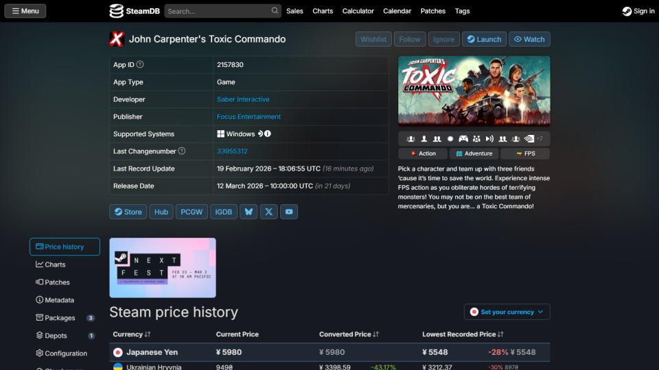 John Carpenter's Toxic Commandoの世界各国と日本の販売価格を比べると、最安値とは「+2,149.41円」の価格差があります。