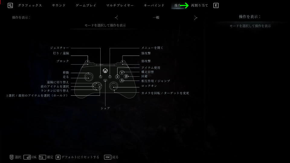 Lords of the Fallenの「コントローラー設定」は、上部メニューの「操作」で確認します。
