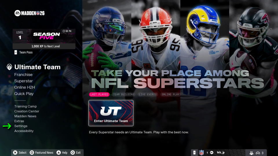 Madden NFL 26の操作を確認するには、タイトルメニューから「Settings」に進みます。