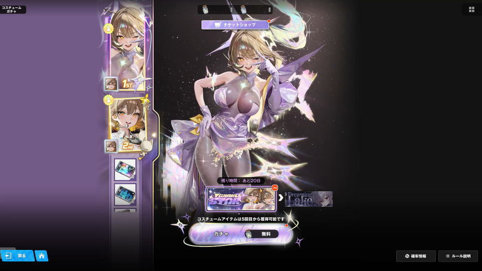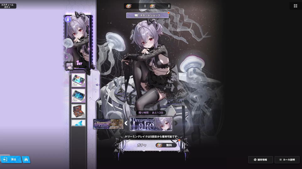 ドリーミングレイクは「コスチュームガチャ」で入手できます。