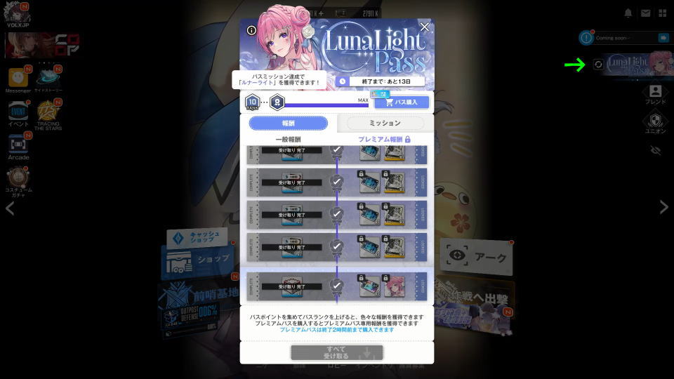 ルナーライトは「LUNA LIGHT PASS」のランク10到達と、プレミアムパスの購入で入手できます。