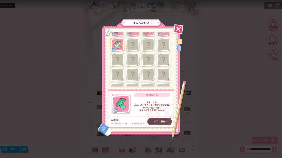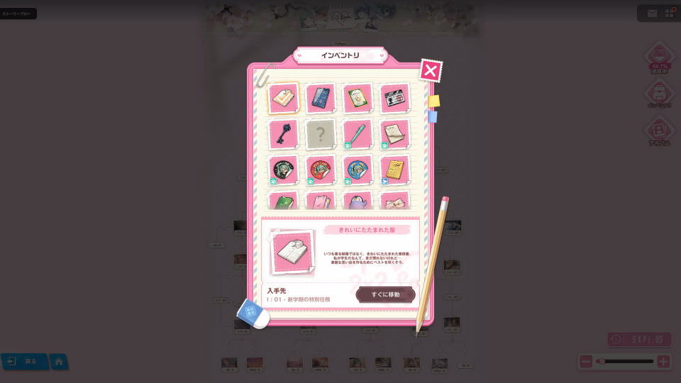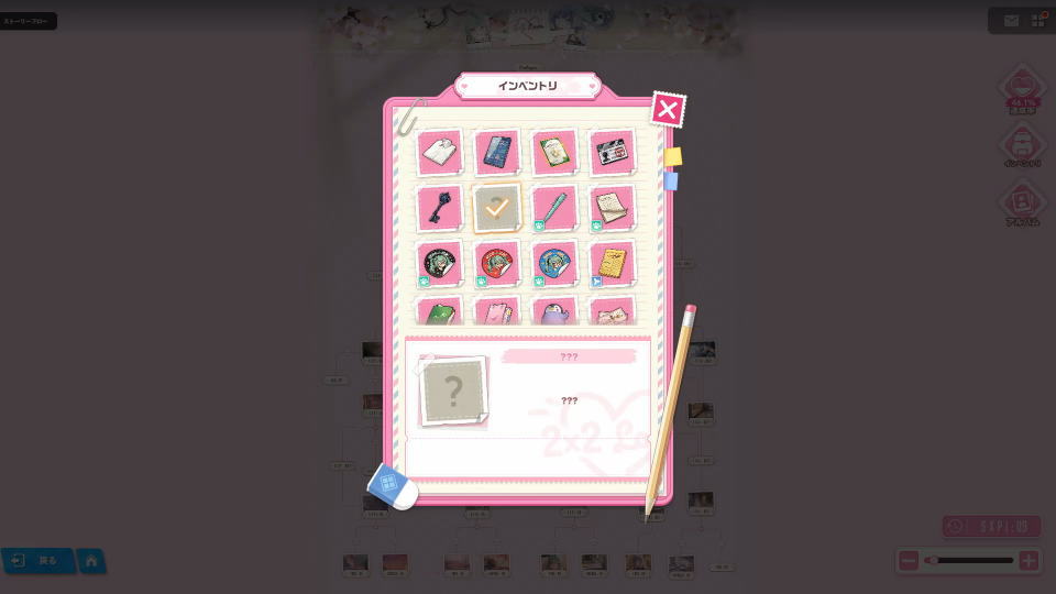 アイテムを確認するには、2X2 LOVEの「ストーリーフロー」の右側にある「インベントリ」を選択します。
